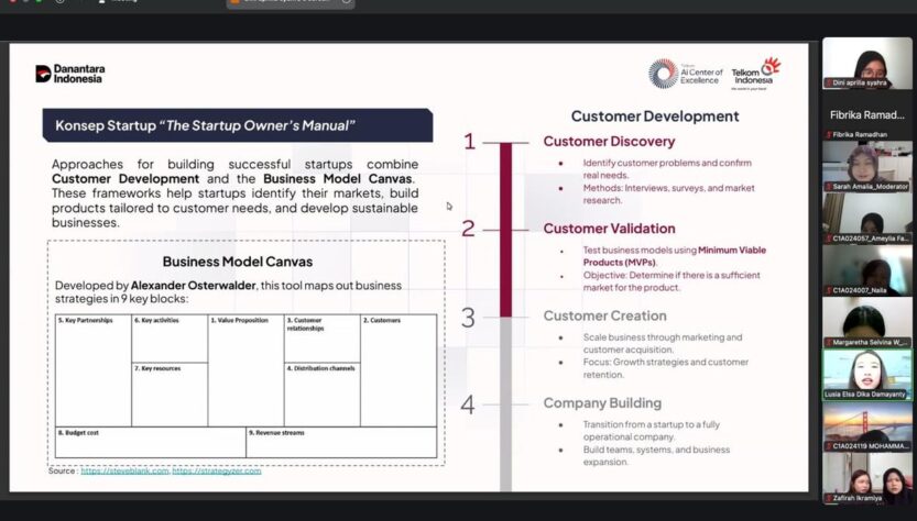 Sesi materi dibawakan oleh Lusia Elsa Dika Damayanty, Business and Community Lead Telkom AI Connect Bandung, yang menghadirkan perspektif technopreneurship berbasis AI. Dalam pemaparannya, Lusia mengangkat konsep startup yang merujuk pada pemikiran Steve Blank, bahwa inti dari sebuah startup bukan terletak pada produk, melainkan pada customer needs. Mahasiswa diajak memahami bahwa secanggih apapun teknologi yang digunakan, nilainya akan rendah apabila tidak berangkat dari kebutuhan nyata pengguna. Konsep ini menjadi landasan penting dalam memanfaatkan AI, di mana inovasi harus dimulai dari problem yang tervalidasi, bukan sekadar eksplorasi teknologi.